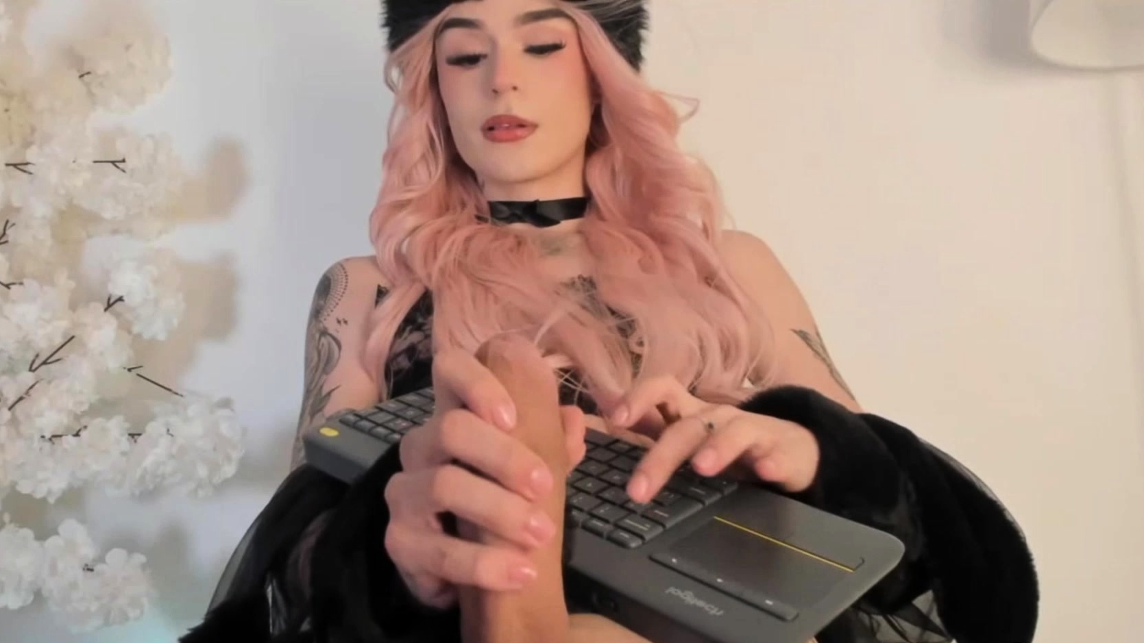 Hot pink haired sissy tgirl stroking her huge cock