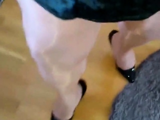 Crossdresser in shiny nude pantyhose and high heels