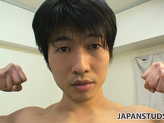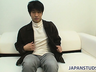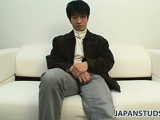 Masayuki sits on the couch and gets up to show off his tight body